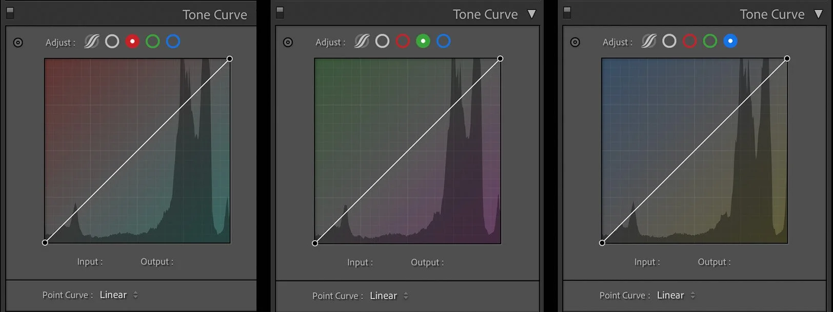 The Tone Curve can also specifically target the RGB (Red, Green, Blue) color channels individually where moving the curve up or down will add a specific color into the image while removing its opposite color (For Example - adding Red means removing Greens).