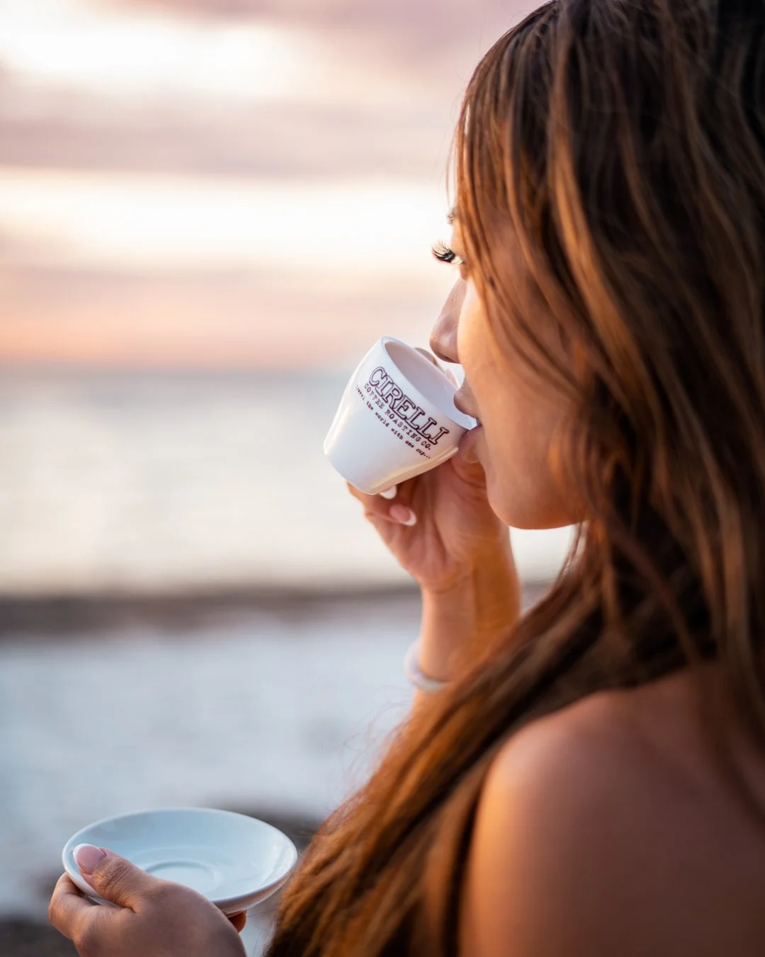 A woman with long brown hair is drinking from a white coffee cup with the word 'Cirelli' on it, holding a small matching saucer, with a blurry outdoor setting and sunset in the background.