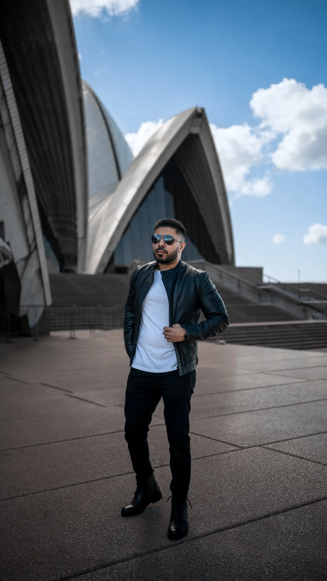Man wearing sunglasses, black leather jacket, white shirt, black pants, and black boots standing outdoors in front of the Sydney Opera House with a partly cloudy sky.