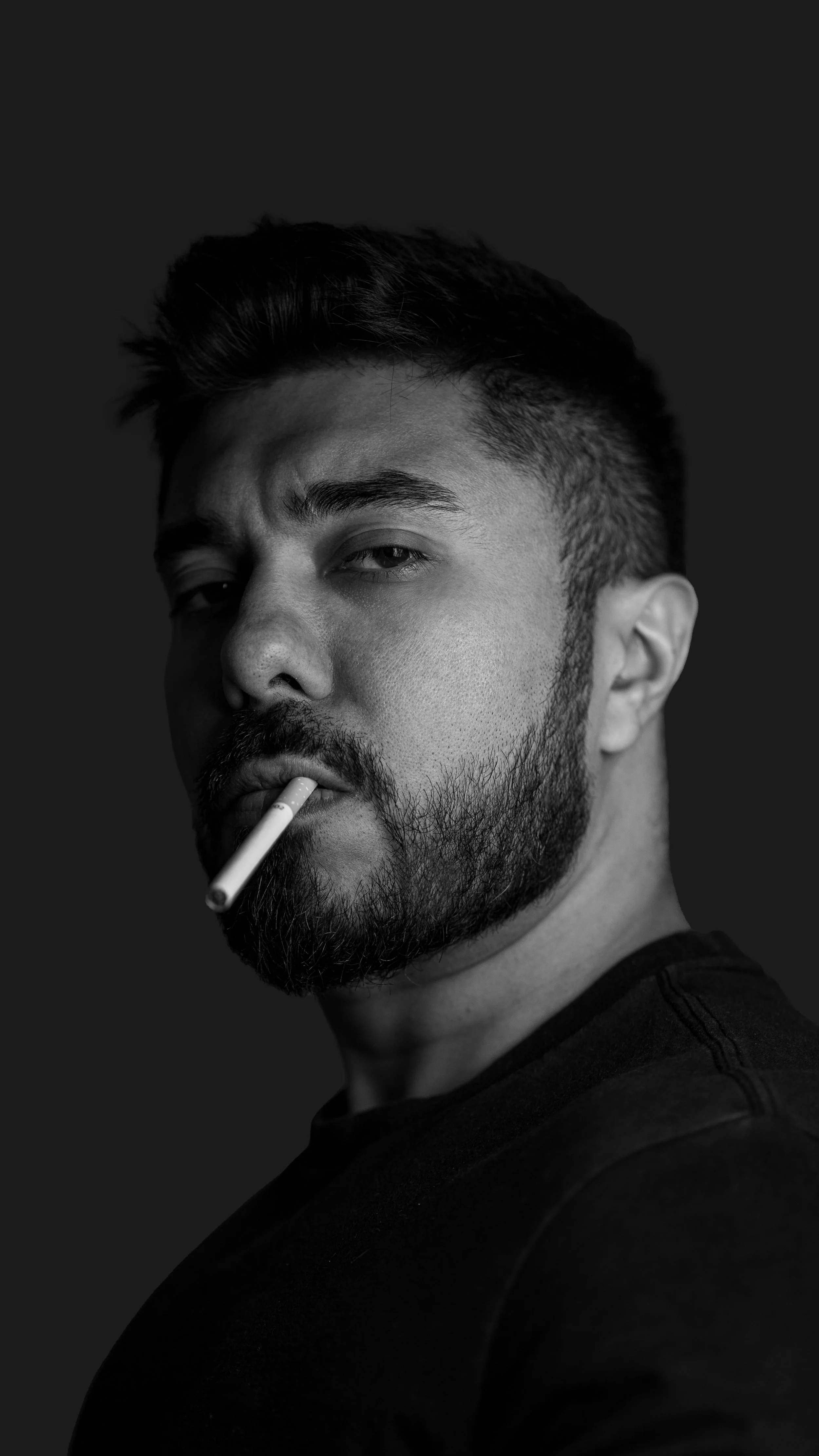 a black and white photo of a man with a cigarette in his mouth looking at the camera with a mean and menacing look View fullsize
