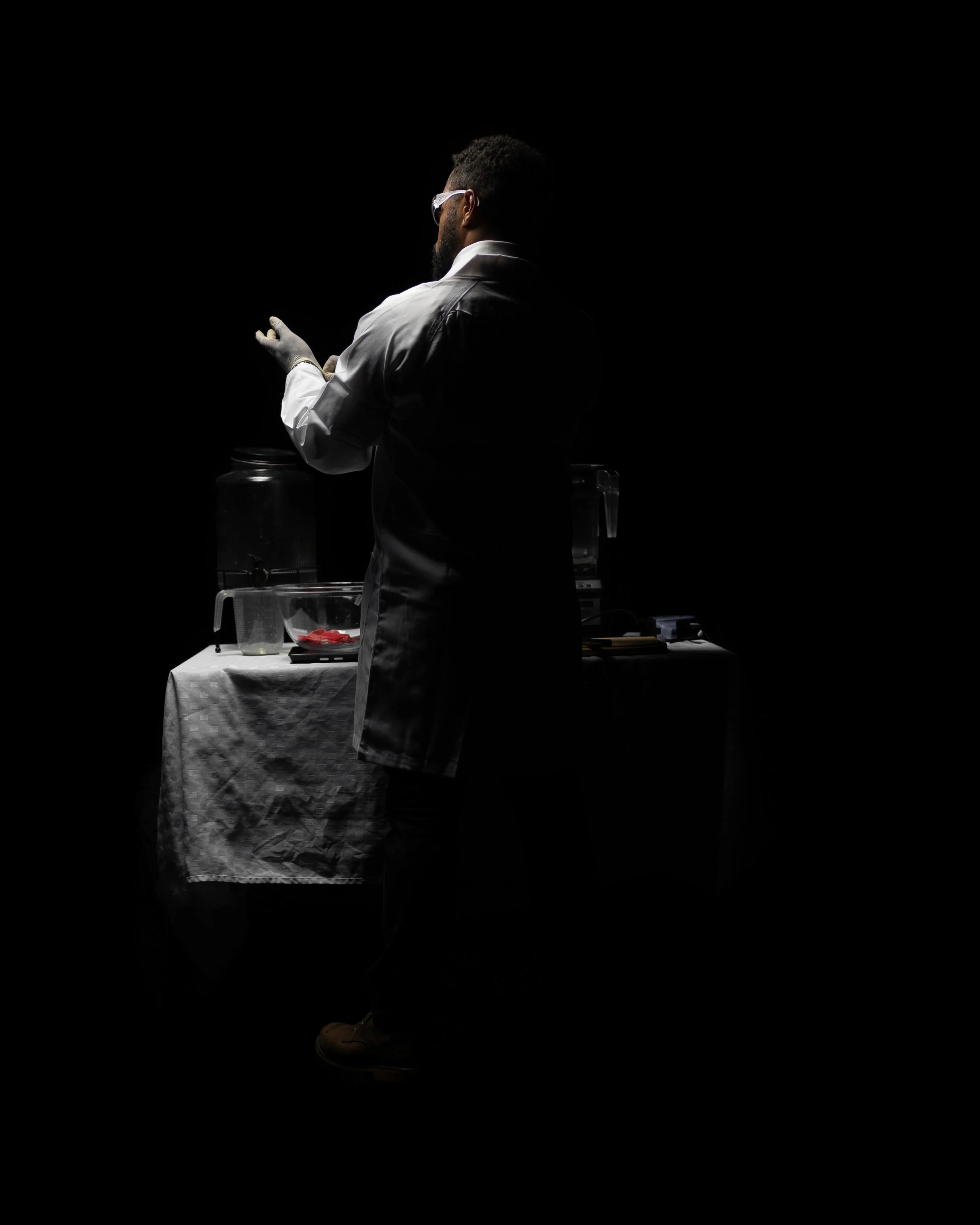 A scientist or chef in a white lab coat and gloves working at a table, with the scene illuminated from behind in a dark setting.