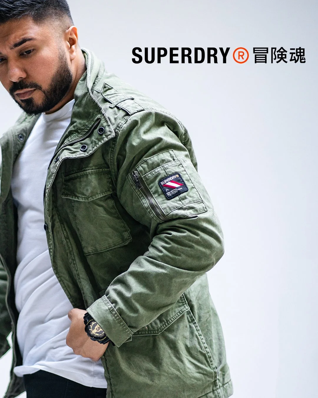 A man wearing a green military-style jacket with a Superdry logo patch on the sleeve, standing against a white background with Superdry branding in black and red text.
