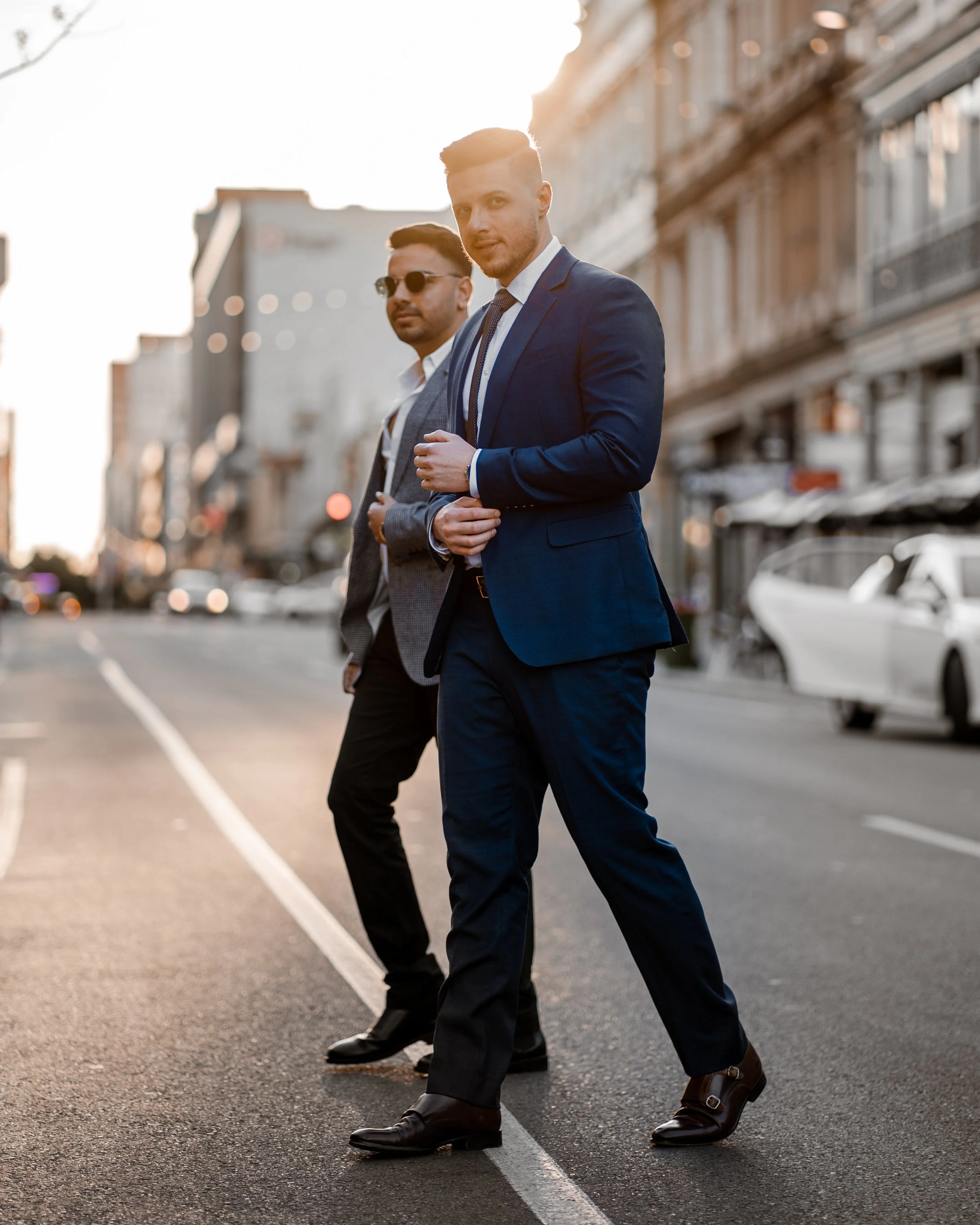 A man in a beige trench coat, black pants, and black shoes walking across a city street at sunset, wearing sunglasses and a watch, with buildings and shops in the background. View fullsize