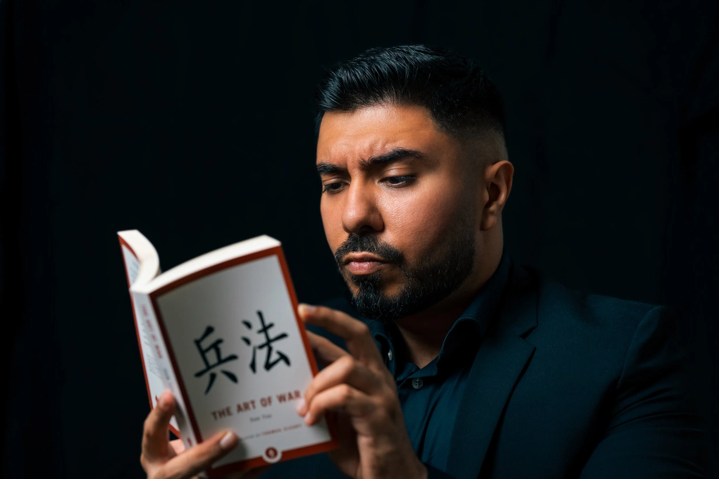 A man with dark hair and a beard reading a book titled "The Art of War" against a dark background.