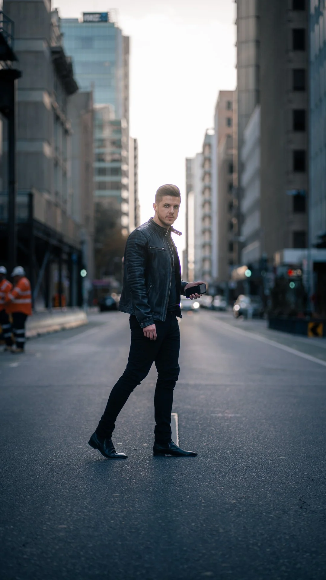 A man in a black leather jacket and black pants crossing a city street at dusk, holding a smartphone in his right hand, with tall buildings and construction workers in the background. View fullsize
