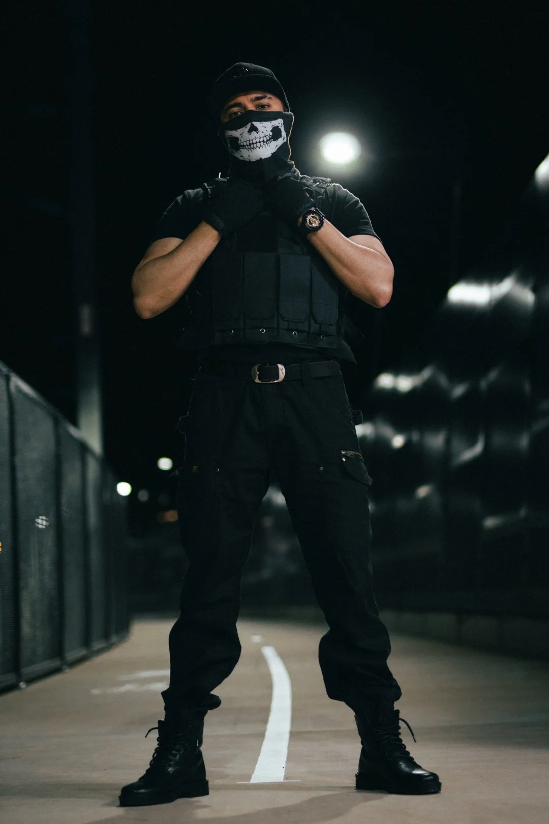 a man in all black outfit with a tactical bulletproof vest, a balaclava with skull print, a casio g-shock watch, military boots and NY cap, standing menacingly staring at the camera View fullsize